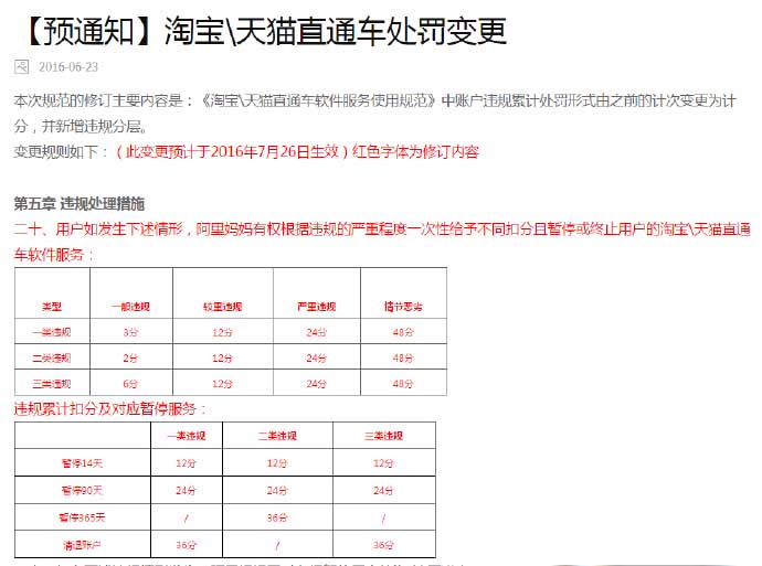本次规范的修订主要内容是:《淘宝/天猫直通车软件服务使用规范》中账户违规累计处罚形式由之前的计次变更为计分,并新增违规分层。