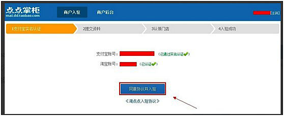 第三,准备好资料后,就进入mai.dd.taobao.com商户入驻页面。当认证进度如下图(淘宝身份认证为审核中,也可进行下一步操作),点击【同意协议并入驻】即可。