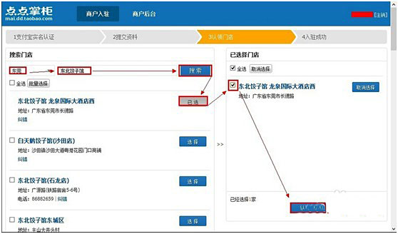 第五,进入下个页面后,选择你所在的城市,再输入你店铺的名称。如果有需要点击【选择】最后【认领】