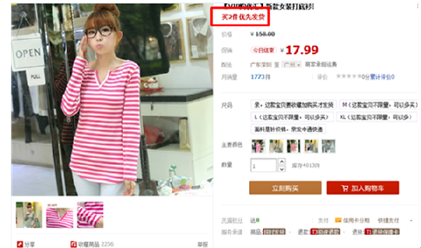 主要包含有参加“VIP购优汇”活动;买两件优先发货; 收藏购买才发货等。而对于情侣装,还可以采套餐搭配活动、 满就送活动 和4件包邮活动等。