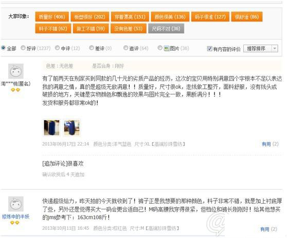 大家印象,评价为推荐排序 有用户信息(注册,穿着体验)图片 ,追评,有用。等几个内容。经过测试,正面评价在第一页的结果。