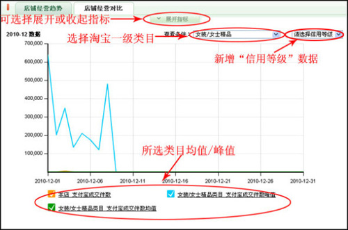 在“店铺经营对比”中,您可以查看主营类目经营对比趋势,并加入了淘宝一级类目的峰值、均值数据、所选类目的店铺数及店铺在所选指标的排名情况。您可以自定义选择查看淘宝所有一级类目与自家店铺的数据对比,也可以单选查看主营类目下的对比指标。现在更添加“信用等级”的筛选,但是此项数据只提供12月以后的数据哦~