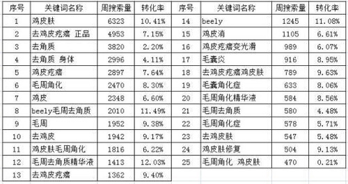 当宝贝名称表格出来后,我们就需要逐个关键词去分析了,分析工具就是淘宝的搜索栏。经过我自己的搜索我发现有些关键词对我来说不是很有用,比如:50ml、洋甘菊、药妆等 而且这些关键词也不在上面我数据魔方TOP词表中,所以我果断的取舍了这几个关键词。而 Beely、毛周去角质精华液、去鸡皮疙瘩等几个关键词是在词表里的而且是比不可少的,因此要保留这些关键词。现在我们要做的就是接着确定剩下的几个关键词。