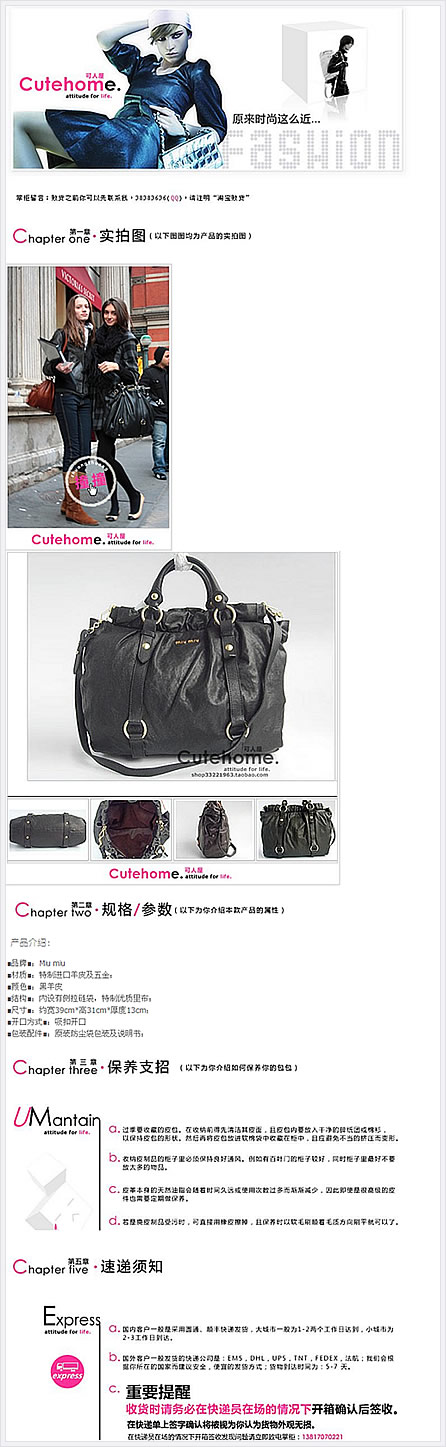 店铺装修也是比较重要的一个环节,试想用一个粗制滥造的店铺里面放上售价上千的包包,首先从视觉上面就拒绝了你的客户。所以,要做一个风格适合你的产品的店铺,最好还是多看看其它卖家的装修情况。最后再结合自身的情况进行界面的规划。以我的店铺为例,我是做时尚包袋销售的,客户多半是白领或者有一定消费能力的女性。那么从风格上我就选择了较为时尚、简约、个性的风格。颜色上面也选择了适合女性的冷紫红色(主要是为了能够稍微的突出一点高贵的特性,呵呵),在这里,我要提醒一下用户,装修的时候,图片质量不要做太大,不然会影响用户访问你店铺的速度。为了兼顾漂亮和速度,我投入了200多元购买了空间和域名,可能有同学会说,还没赚钱就花了钱了,好多地方有免费空间提供呢,干嘛不用。这里,我想说的是一份价钱一分货,免费空间不是不能用,只不过空间使用的主动权不是由你自己掌握的,如果有哪天对方服务器当机或者禁止外链了,这对卖家来说是多么大的损失啊,用户打开你的站点,看到的都是叉叉,那是一种什么样的感觉?而且如果遇到该空间禁止图片外链,而上家有上千种货品的时候,哭都来不及了。当然,如果本身对服务器和域名不太熟悉的用户,开始的时候可以不用考虑我采用的方式,哈哈(另外沾沾自喜一下,我选的空间性价比还不错,速度快不说,还是双线的哦,这样南北用户都能兼顾啦,哈哈。。。不好意思,又扯远了)