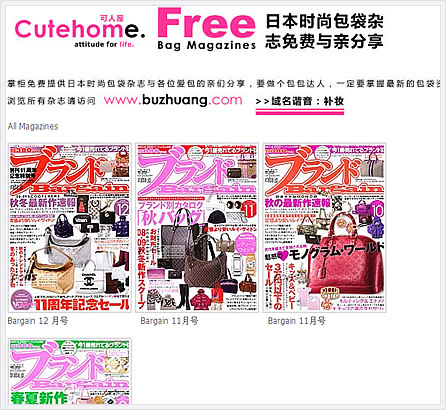 平时在公司做项目做多了,一心总是在想,如何能够为用户提供更多的增值服务,让用户能够喜欢上你。这一点我可是费了不少精力。上班路上也在想,睡觉之前也在想(但我发誓,肯定没有影响平时的工作,吼吼)后面,终于想到了一个点子,免费提供给买家(或者潜在买家)日本时尚包袋杂志(当然是电子版的)看。毕竟来买包包的同学大部分都是爱包之人,所以这个东西肯定能吸引人的。(插一句,以前掌柜自己做过一个网站,专门提供日本时尚杂志下载的,流量还挺高的,这东西实践过,有市场,有人气)。于是又昏天黑地的去搞了日本专业包袋时尚杂志,一张一张的上传到博客里面。一般一本杂志200多页,我滴神啊...这上传的工作量简直让人狂晕。。。不过想到能让更多的同学看到,心里也算有些安慰。终于杂志也上去了。每次在和买家聊生意,顺便说道能提供她们免费日本杂志看的时候,买家都很开心。看来,这个服务没有白做哦:)