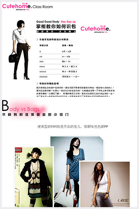 开店一段时间之后,我发现很多客户基本都会问我们的货是什么货?是*货吗?开始的时候,我不厌其烦的跟客户说明,*货也分很多种的....后面想想,既然好多用户都有这样的问题,干脆做一个课堂,同他们来分享一下这方面的知识吧。于是立刻查了相关的信息,得到了比较权威的答案,开出了一个“好好学习天天向上”的板块,这样,日后用户遇到这方面的问题,我就直接引导她去访问这个页面,所有的问题就迎刃而解啦。最近又有很多用户在问身材与包包选择的问题,于是我又增加了这方面相关的知识,这样,更多的用户在选择包包的时候就容易多了。