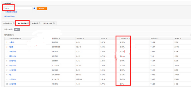 从上图我们可以看出来昨天一天关键词的点击率情况,那么这个时候我们可以根据你推广产品的属性来选择一些高点击率的词出来作为你前期推广的关键词去培养。