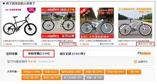 那么,在这里,我们以“山地自行车”为例来跟大家一起分享下如何去做这个分析。假设我们卖的自行车价格是1500,那么,我们最直接的竞争对手就是价位在1500左右的那些产品,接下来找出与我们最直接最强劲的竞争对手,再来分析那个最强劲的竞争对手的顾客累计评价。那么,接下来大家可以跟着我一起去做一下。