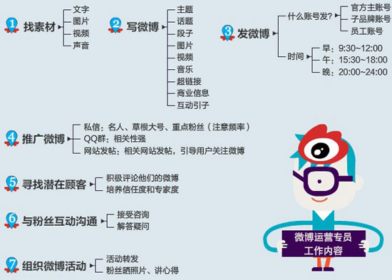 那微博专员的工作内容包括什么?nbsp; 找家材。素材包括文字、图片、视频和声音。找的素材要与微博定位、店铺定位、品牌定位相符合。