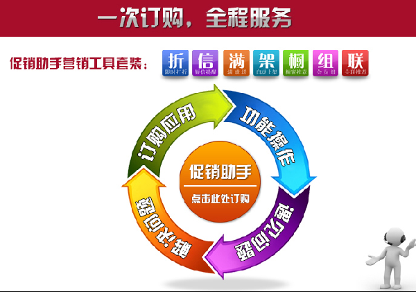开店离不开促销,促销不仅要做好折扣设置,满就送等功能,还要优化宝贝上下架等。如果你都是手动操作,恐怕会很累。何不尝试下用“促销助手”工具呢? 促销助手提供从商品打折(限时打折)、根据卖家设置的条件进行优惠(满就送)、优化宝贝排名引流(自动橱窗和自动上下架)、最大程度的利用进店流量(关联推荐)、客户关怀(发货及物流提醒)。 具体功能如下: