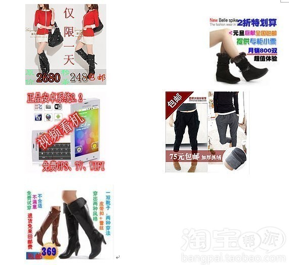 二是过多的文字图片掩盖了宝贝真实的面貌,不能很好的辨认出宝贝细节。不利于淘宝公平的诚信的交易。原则上主图上可以有商品LOGO存在也可以添加最多一个的促销水印标签等文字的或者图片形式广告,但是这些文字和图片大小不得超过主图面积的百分之十,且不得覆盖主图商品,淘宝会根据情况.对于部分牛皮藓化严重的商品给与一定程度的降权或者是屏蔽处理。