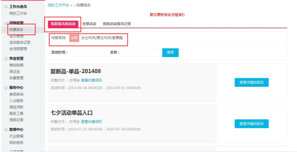 第一步:进入聚划算平台—找到“我的工作台”,点击"我要报名",列表选择"我能报名的活动",查看符合您店铺经营类目的活动列表。