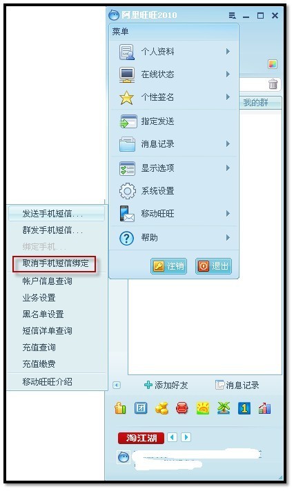 点击阿里旺旺主窗口中的“菜单”按钮,选择“移动阿里旺旺”,点击“取消手机短信绑定”: