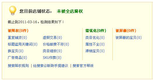 通过淘宝搜索诊断助手,你可以查询到你店铺因为重复铺货、虚假交易、标题滥用关键词、价格邮费不符、换宝贝、类目错放、广告商品、SKU作弊等降权原因,同时也提供了那行宝贝可以进行类目优化、属性不全、滞销宝贝优化。也可以查询到那行产品被淘宝屏蔽了。