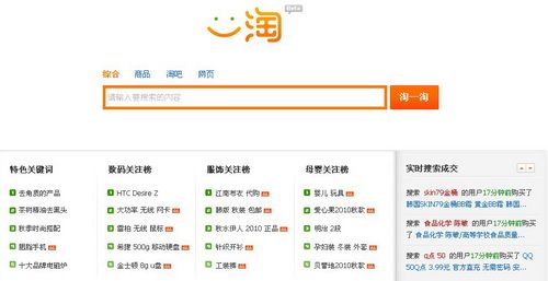 与之前流出的内测截图有所不同,一淘网搜索按钮由“淘一下”换称了“淘一淘”。此外,一淘网首页推出了特色关键词、数码关注榜、服饰关注榜、母婴关注榜四大类,并有“实时搜索成交”栏目。